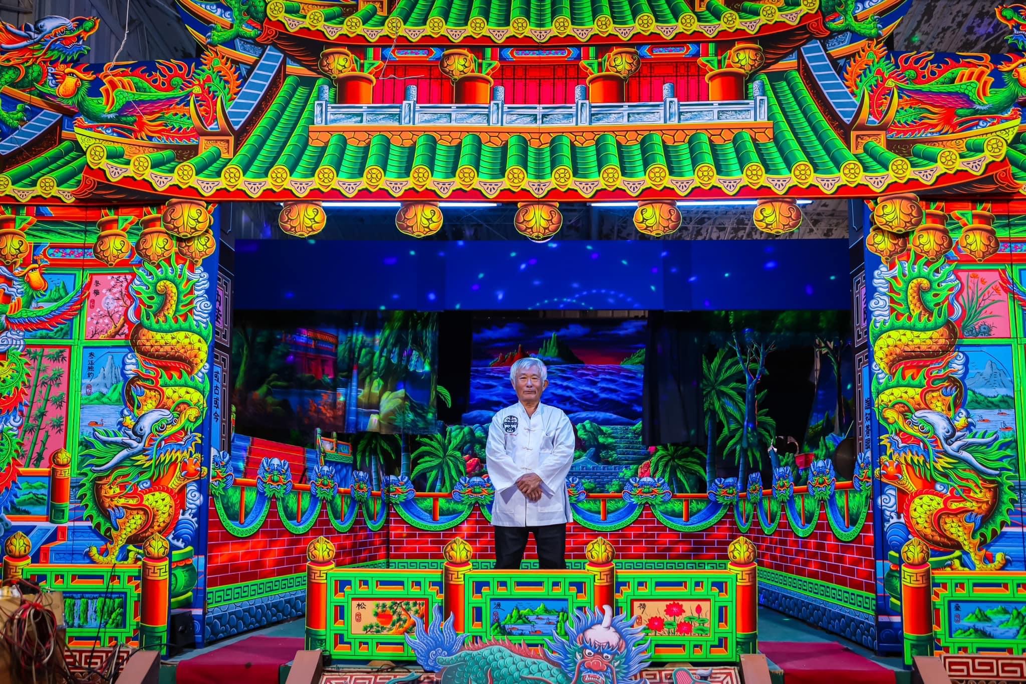 走進陳明山台灣民俗布景工作室,一頭白髮隨興紮著馬尾的老師早已等候多時。他熱情又感性地介紹這個奇幻的藝術空間,色彩繽紛的舞台布景盡在眼簾。這個空間是在28年前,當老師大約44歲時為了教學與傳承而獨立設計的。這不僅是一個藝術聖地,更像是個溫暖的家。在這裡,彩繪藝術與詼諧人生交織出最美的風景。與明山老師的對話讓人心曠神怡,他的話語深刻地傳達出對彩繪藝術的極致追求和對薪火傳承的殷切企盼。